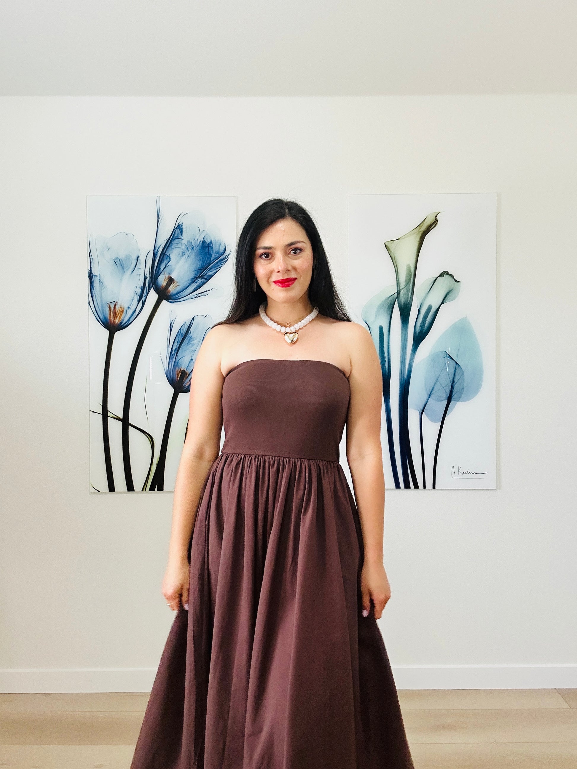 Timeless, elegant, and effortlessly flattering ā this strapless chocolate brown maxi dress is the kind of piece that makes a statement the moment you walk in. The stretchy fitted bodice provides comfortable support while contouring beautifully, and the flowy full-length skirt creates a soft, feminine silhouette that moves gracefully with every step.