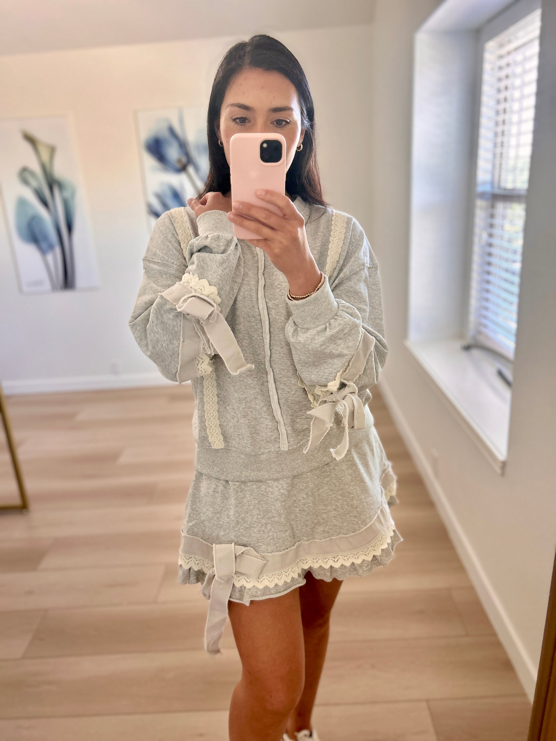 This isn't just any sweatshirt—it's the cutest loungewear piece you'll own! Featuring charming bow details, this gray sweatshirt is perfect for staying comfortable while looking effortlessly put-together.